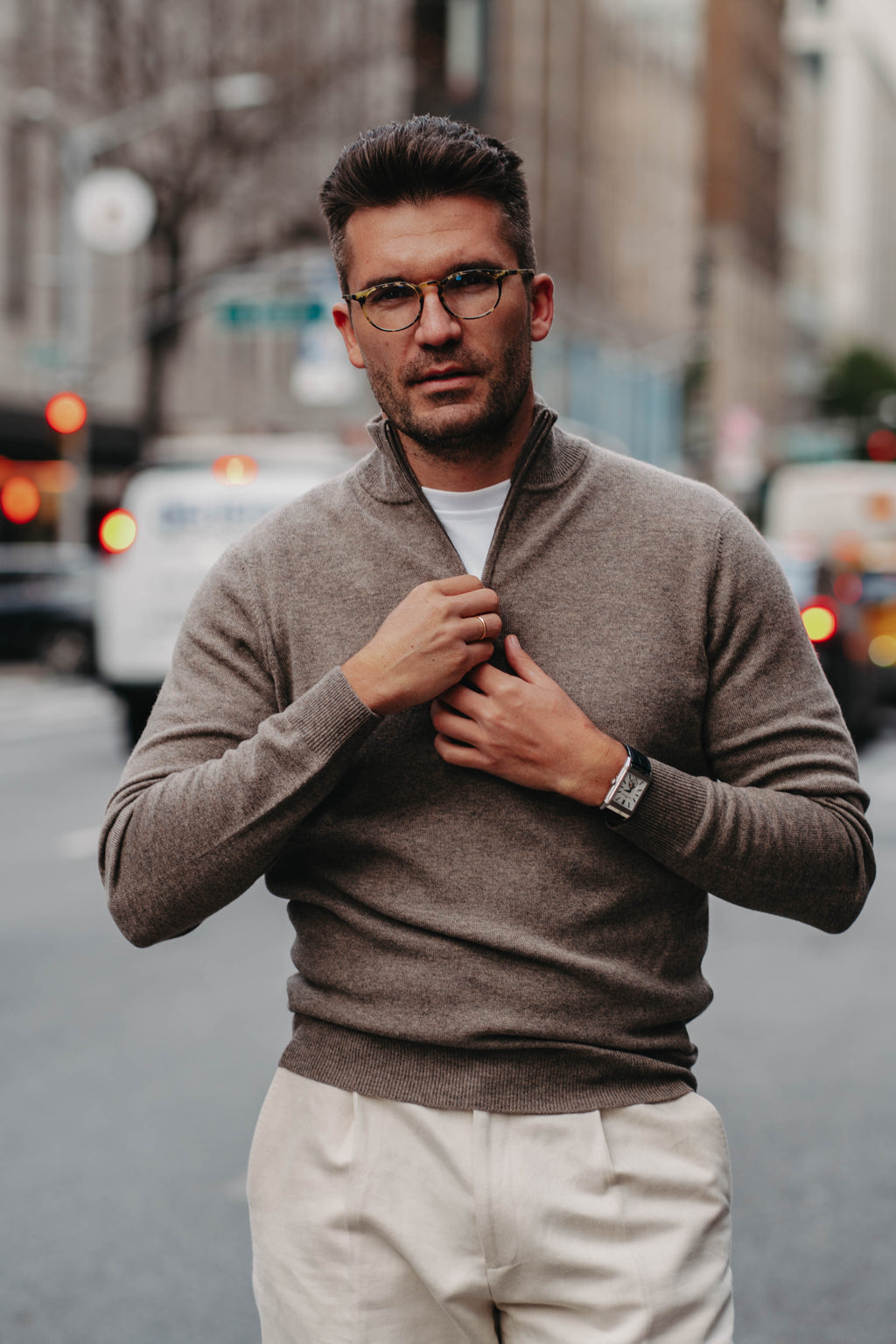 Die besten Basics. Das war unser Ziel und dies hier ist unsere Antwort darauf. Ein hellbrauner Half-Zip Pullover aus einem Merinowolle / Kaschmirmix gehört daher zur Grundlage für die kalten Tage. Stofflich haben wir damit die bestmöglichen Eigenschaften (atmungsaktiv, weich, geruchsunempfindlich, isolierend), farblich und stilistisch gesehen liegt dir damit aber auch die Kombinationswelt zu Füßen!
